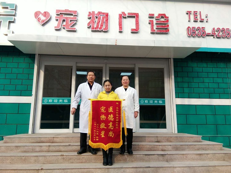 當(dāng)日,“虎”的主人趙女士為牟平區(qū)鳴康動(dòng)物醫(yī)院寵物門診的張典玉、孫霞兩位寵物醫(yī)師以及全院的工作者送來錦旗,錦旗上寫“醫(yī)德高尚 寵物救星”。