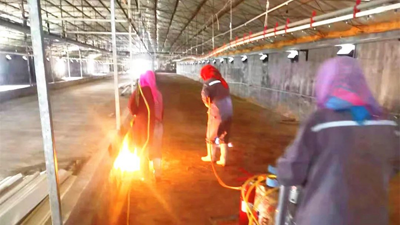 在上一批種雞順利出欄后,第七種雞場在空舍期內(nèi),在對所有雞舍進(jìn)行了徹底清洗的基礎(chǔ)上,又先后進(jìn)行了一次火焰消毒、二次高效消毒劑噴霧消毒、一次表面噴漿處理和一次熏蒸消毒。
