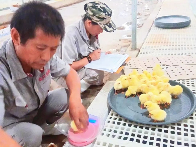 金雞入舍后,工作人員嚴(yán)格按照質(zhì)量評估標(biāo)準(zhǔn)對雞苗進(jìn)行綜合評估。