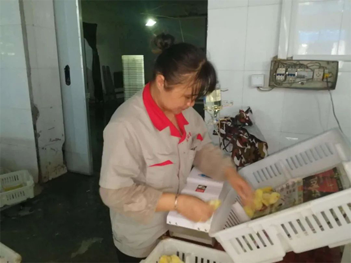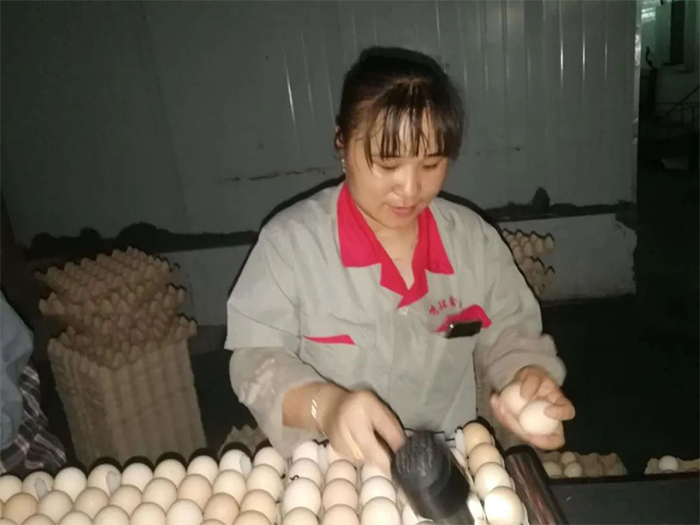 工作中,張莉與照蛋組的家人們右手持燈逐個逐行地照,左手將無精蛋、弱精蛋、死精蛋、臭蛋、破蛋等挑出放在身旁的紙箱里,將小頭朝上的蛋翻過來,照蛋過程頭腦、動作反應要快,對某個種蛋的觀察、判斷要在一瞬間完成,做到 “輕、穩(wěn)、準、快”。張莉帶領的照蛋組為減少細菌污染胚蛋、提高孵化率和雛雞質(zhì)量、合理利用設備、準確推測孵化效果及種雞的生產(chǎn)狀態(tài)打下堅實的基礎。